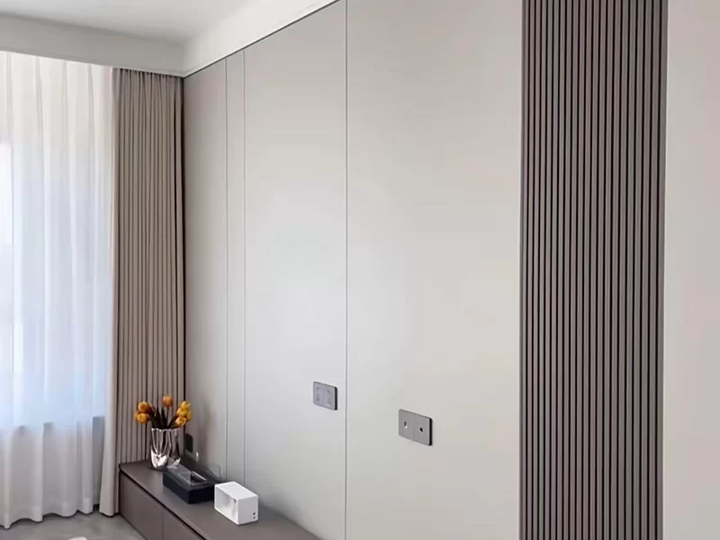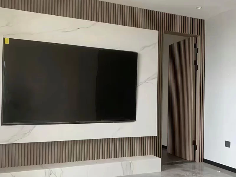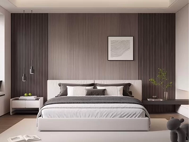 This residential project showcases our wood veneer acoustic slat wall panels in a modern living room and bedroom. The warm oak veneer panels create a cohesive, sophisticated aesthetic,complementing the marble TV wall and minimalistbedroom decor.Beyond their visual appeal, the panels significantly reduce echo and background noise, enhancing the comfort of daily living. The seamless integration of style and functionality demonstrates how our acoustic solutions elevate both the look and feel of contemporary home interiors.