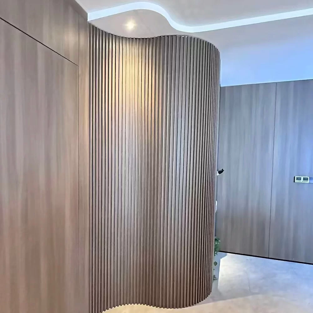 Our flexible fluted wood wall panels redefine interior design with unmatched versatility. Crafted from premium eco- friendly wood composite, these panels boast exceptional bendability, enabling seamless curved installations and creative space division. With a durable,scratch- resistant surface and excellent sound absorption,they combine functionality with modern aesthetics. Available in a wide range of wood grain finishes and colors, they effortlessly elevate any spacefrom minimalist homes to sophisticated commercial environments. Easy to install and maintain, they offer a long-lasting, stylish solution for contemporary interiors.